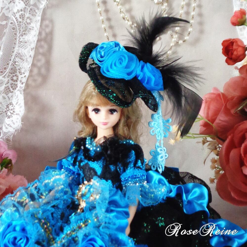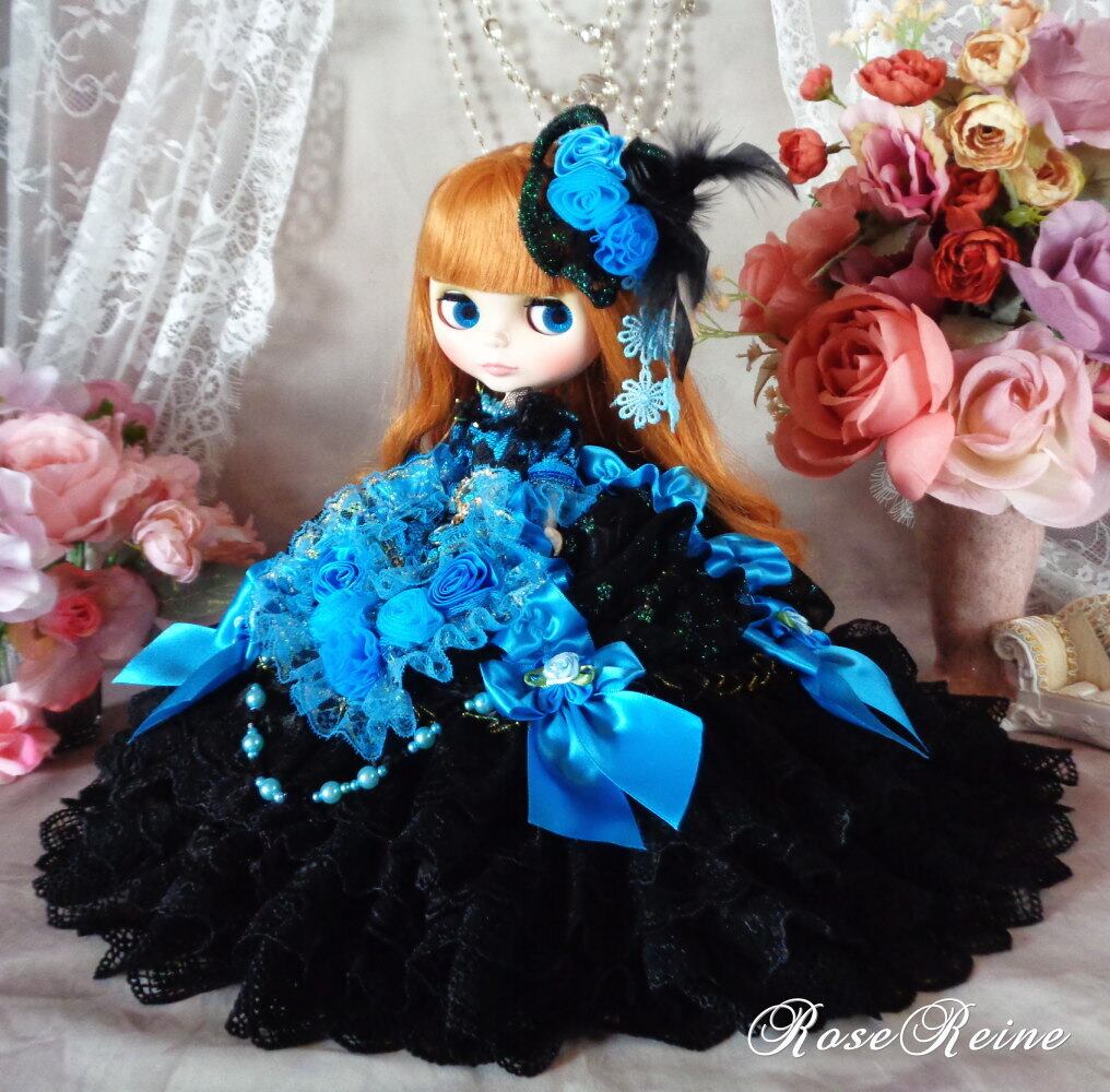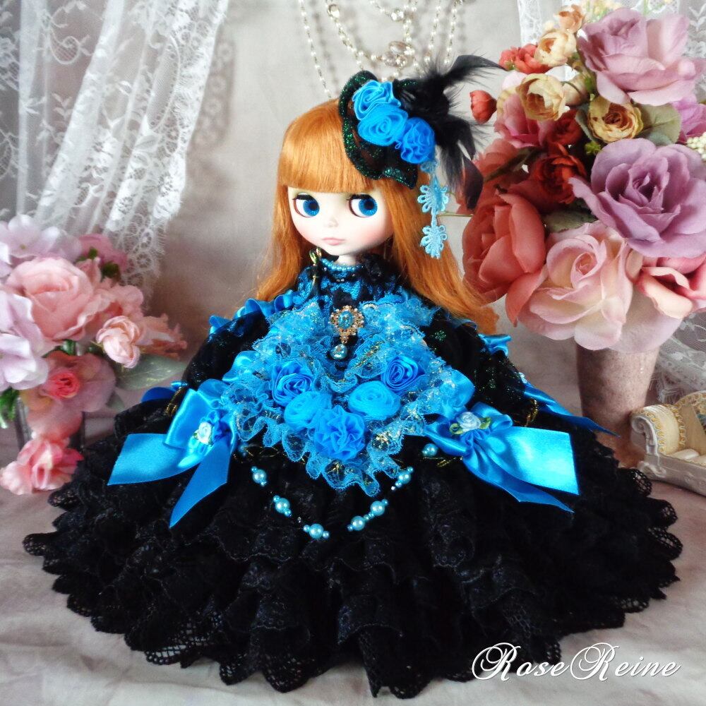 エリザベート王妃 煌めきのトルコブルー&ブラックのバブルフォルムドールドレス