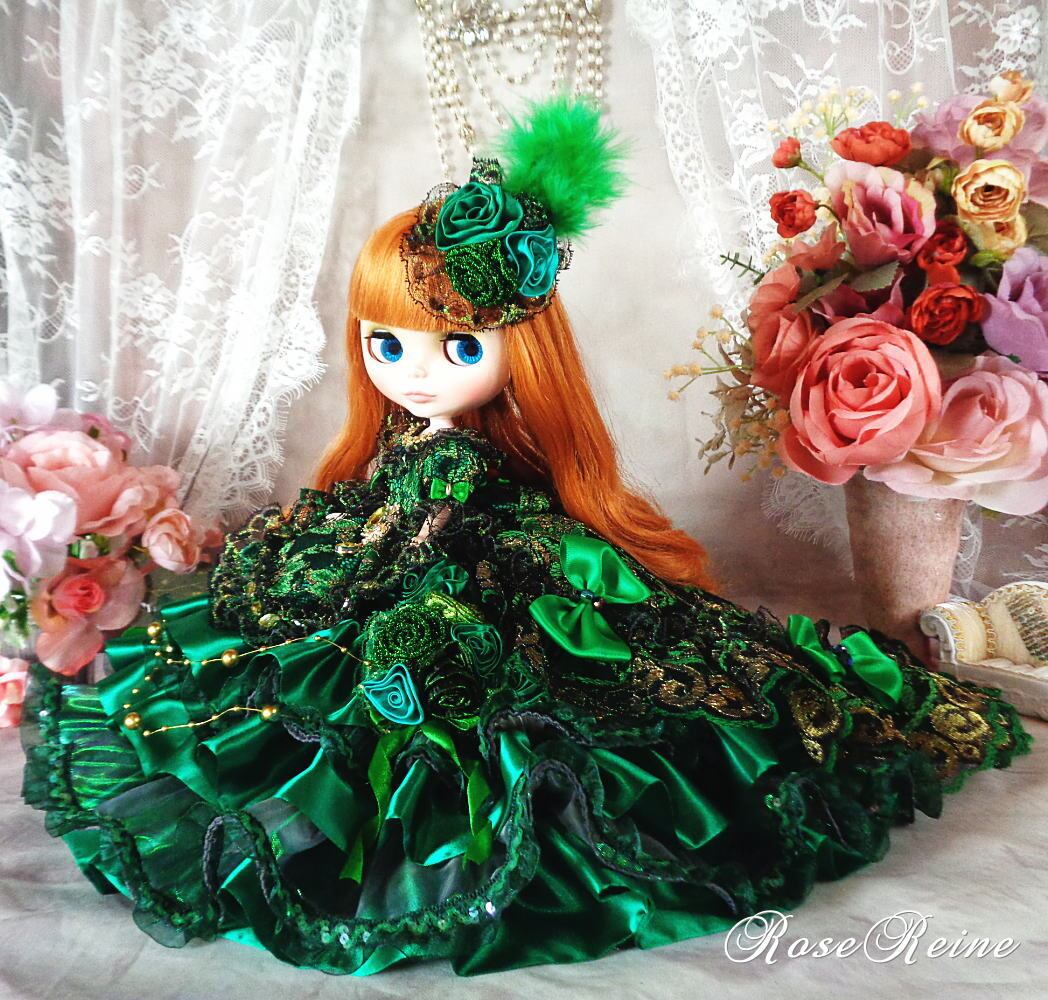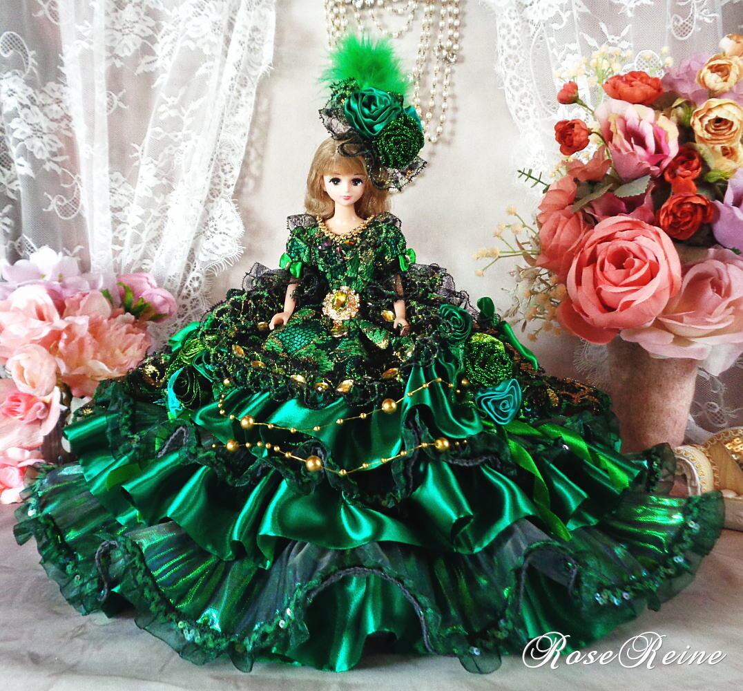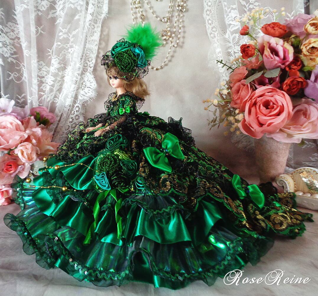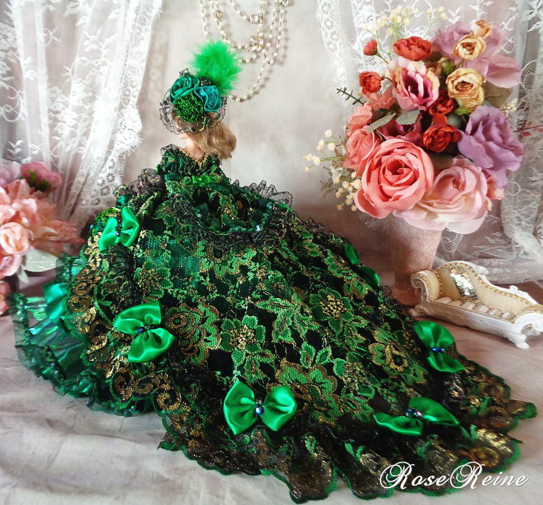 マリーアントワネット王妃 ピーコックグリーンの豪華ロングトレーンドールドレス
